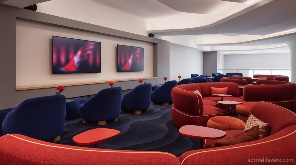 The Clubhouse’s most popular area, the Gallery, has been reimagined to optimize space while preserving its breathtaking runway vistas. Decor elements reflect London’s transport history, with brass accents and vibrant red hues. Custom lighting and curated art installations by UK artists enhance the ambiance.